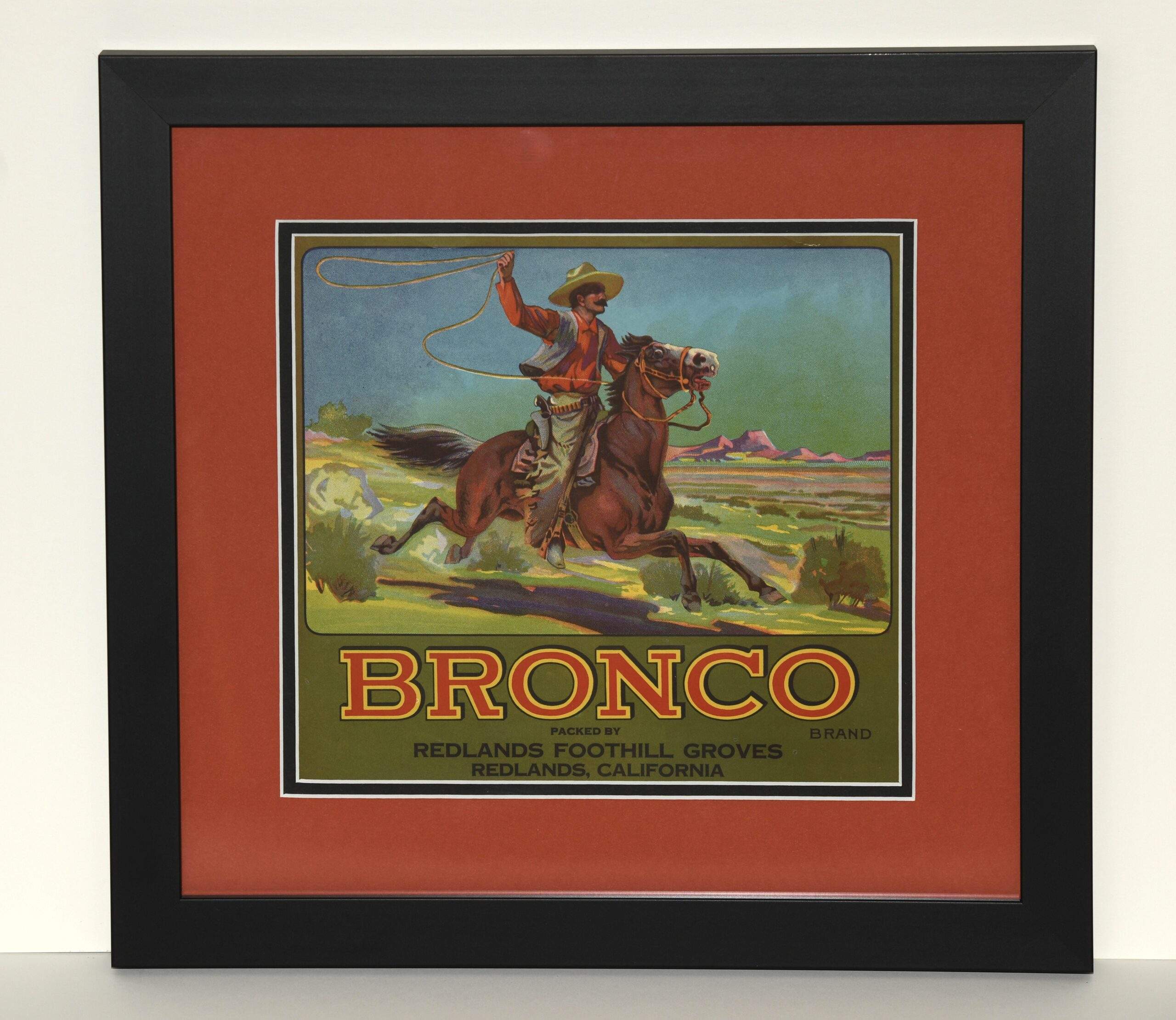 The Bronco Brand label was produced primarily from the 1920s to the 1940s, with a documented print run in January 1949 by Western Litho Co., aligning with the broader peak of California’s citrus crate labeling era (circa 1900–1950), before the shift to pre-printed cardboard boxes post-World War II.