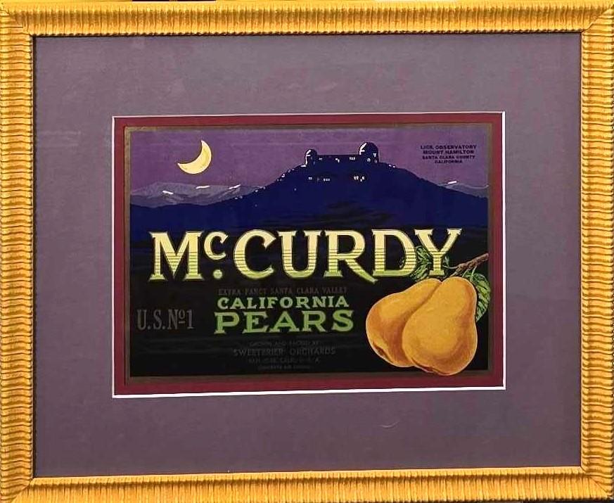The McCurdy California Pears label (often listed as “McCurdy Extra Fancy Santa Clara Valley California Pears” or similar variants like “McCurdy U.S. No. 1 Pears”) is a vintage fruit crate label from the early-to-mid 20th century, associated with pear production in California’s Santa Clara Valley.