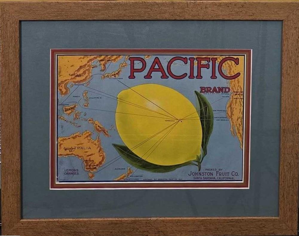 This Pacific Brand Lemons Oranges fruit label is perfect for a kitchen. Copyrighted and Packed by Johnston Fruit Co. Santa Barbara, California. This label was printed by Schmidt Litho Co L. A. and measures 12 3/4 wide by 8 5/8 tall. Framed measurement is 19 1/2 inches by 15 3/4 inches.