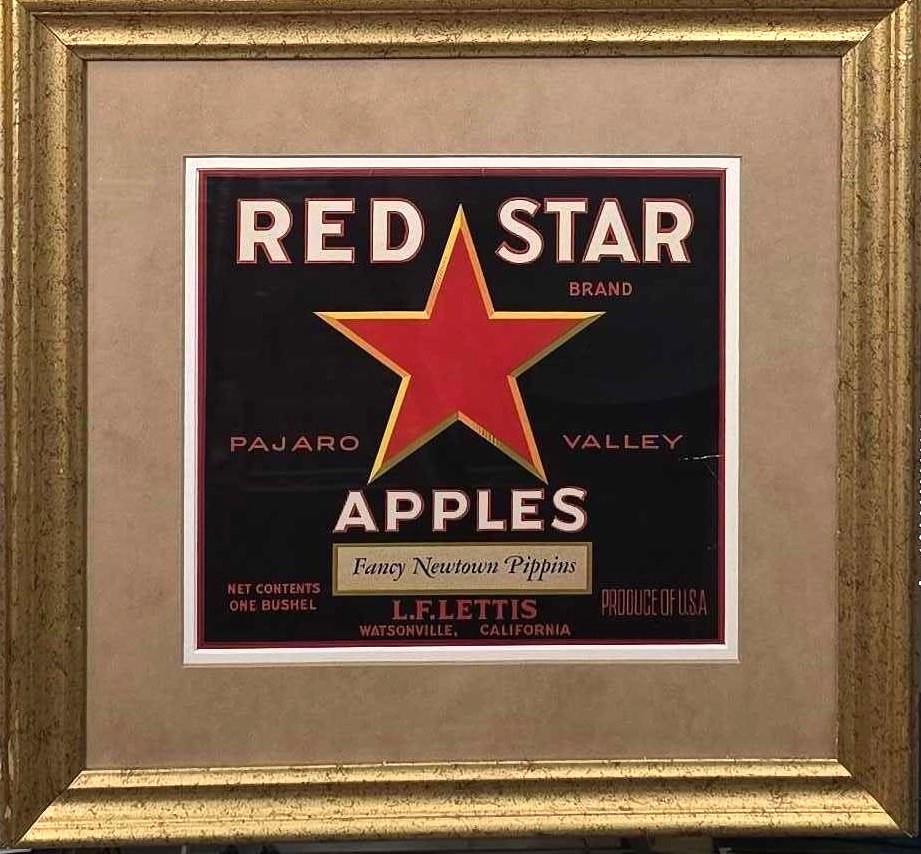 This matted and framed The Red Star Brand fruit crate label (also known as “Red Star Brand” apples, oranges, or citrus) is a vintage example from California’s produce industry during the early-to-mid 20th century. There are distinct regional variants: primarily apples from Watsonville (Santa Cruz County/Pajaro Valley) and citrus (oranges) from Riverside County and Ojai/Nordhoff (Ventura County). These labels were part of the broader colorful lithographed crate label era, used to market fruit shipped by rail.
