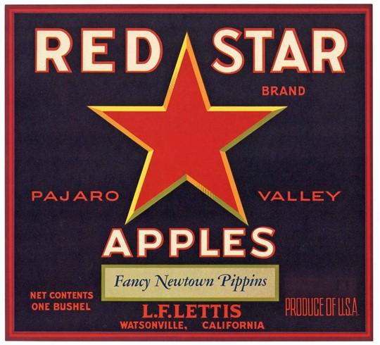 (Example of Watsonville Red Star apples label with central red star and bold text.)