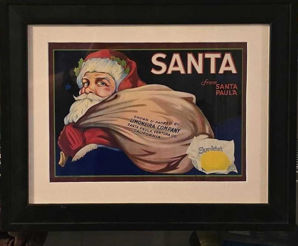 This Blue eyed Santa Claus fruit label, framed and protected, measuring 17 1/2 inches wide and 13 1/2 inches tall, is a guaranteed authentic vintage label associated with the Santa Paula lemon industry from 1928. This label was used on crates of lemons, showcasing the agricultural heritage of California. Framed, matted and acrylic-protected, it is available for lease. The Santa Brand fruit label is part of a collection that reflects the marketing and branding practices of that era. These labels were typically affixed to wooden crates containing citrus fruits, which were a significant agricultural product in California, especially in Ventura County. The Henry Ford Museum features a digital collection entry for the 1928 Santa Brand Fruits crate label, highlighting its historical significance. These labels not only serve as collectibles but also as decorative art pieces that celebrate California’s rich agricultural history. Real Estate agents, brokers and staging companies all market their homes for sale by making the potential buyer feel at home. Perfect for business lobbies and offices, doctors’ offices, real estate agents and brokers to lease vintage art for environmental aesthetics. Framed, matted and acrylic-protected, these beautiful pieces of art are available for lease.
